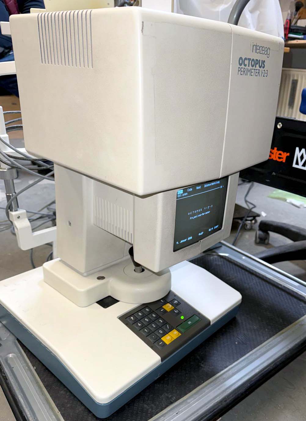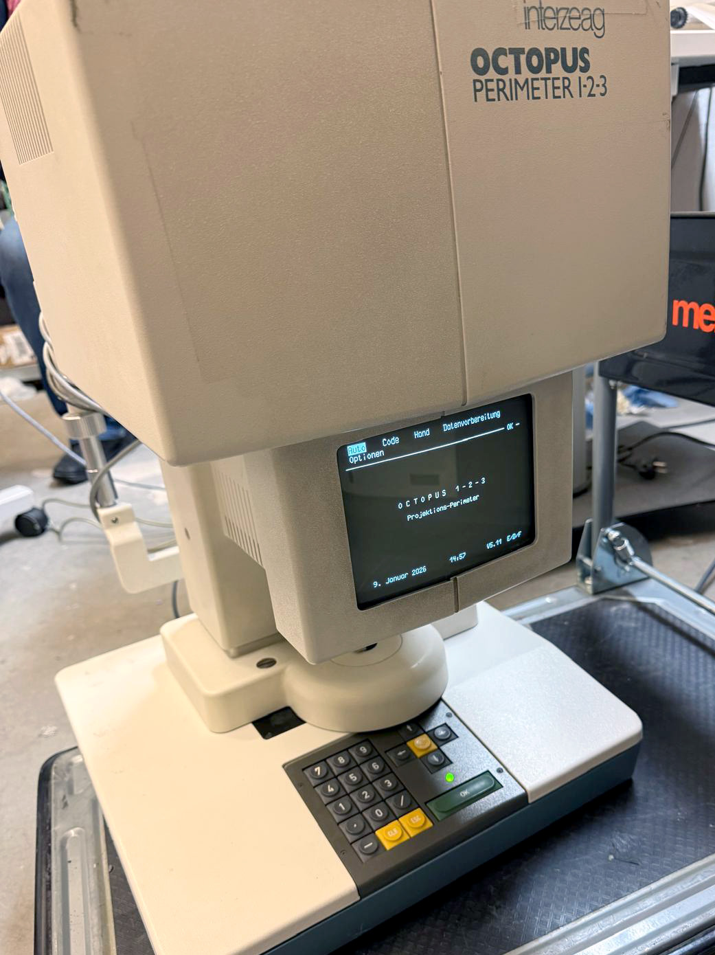 Guter Betriebszustand. Bekannt für seine Zuverlässigkeit und das patentierte Direktprojektionssystem, das keine Dunkelkammer benötigt. Optimiert für das zentrale 30°-Gesichtsfeld. Kernprogramme: Umfasst Standard-Diagnoseprogramme wie G1, M2 und 32. Strategien: Verfügt über die normale (4-2-1 dB) Belichtungsreihenstrategie, die dynamische Strategie und die schnellere TOP-Strategie (Tendenzorientierte Perimetrie).