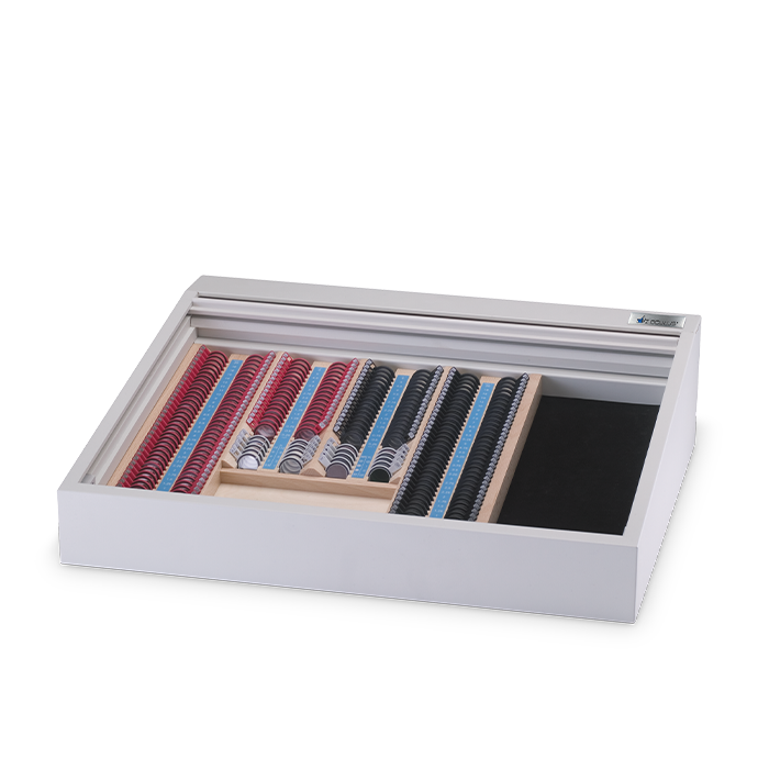 Probierlinsen-Etui, Tisch- oder Wandversion, 228 beschichtete Messlinsen (28 mm)
