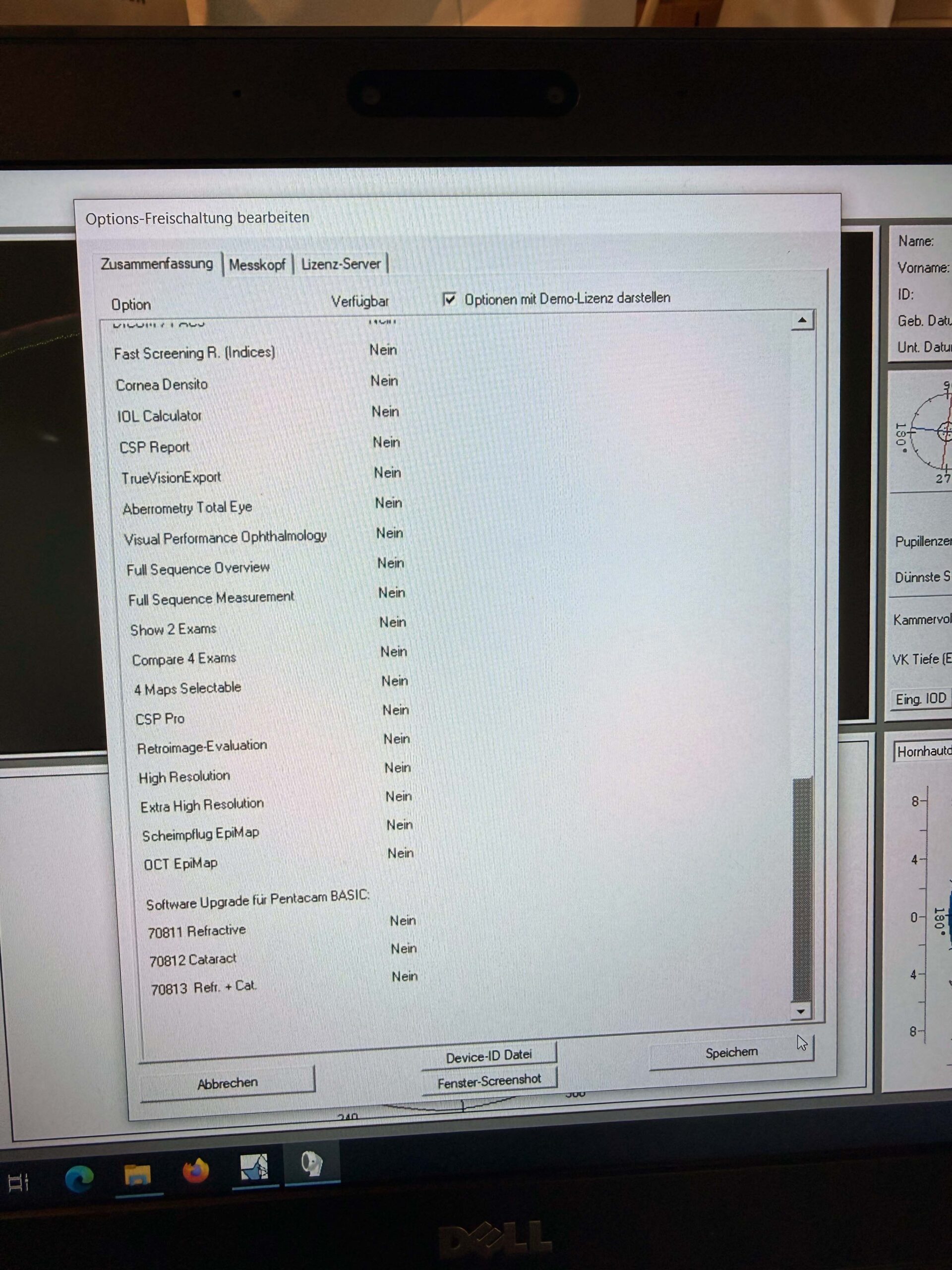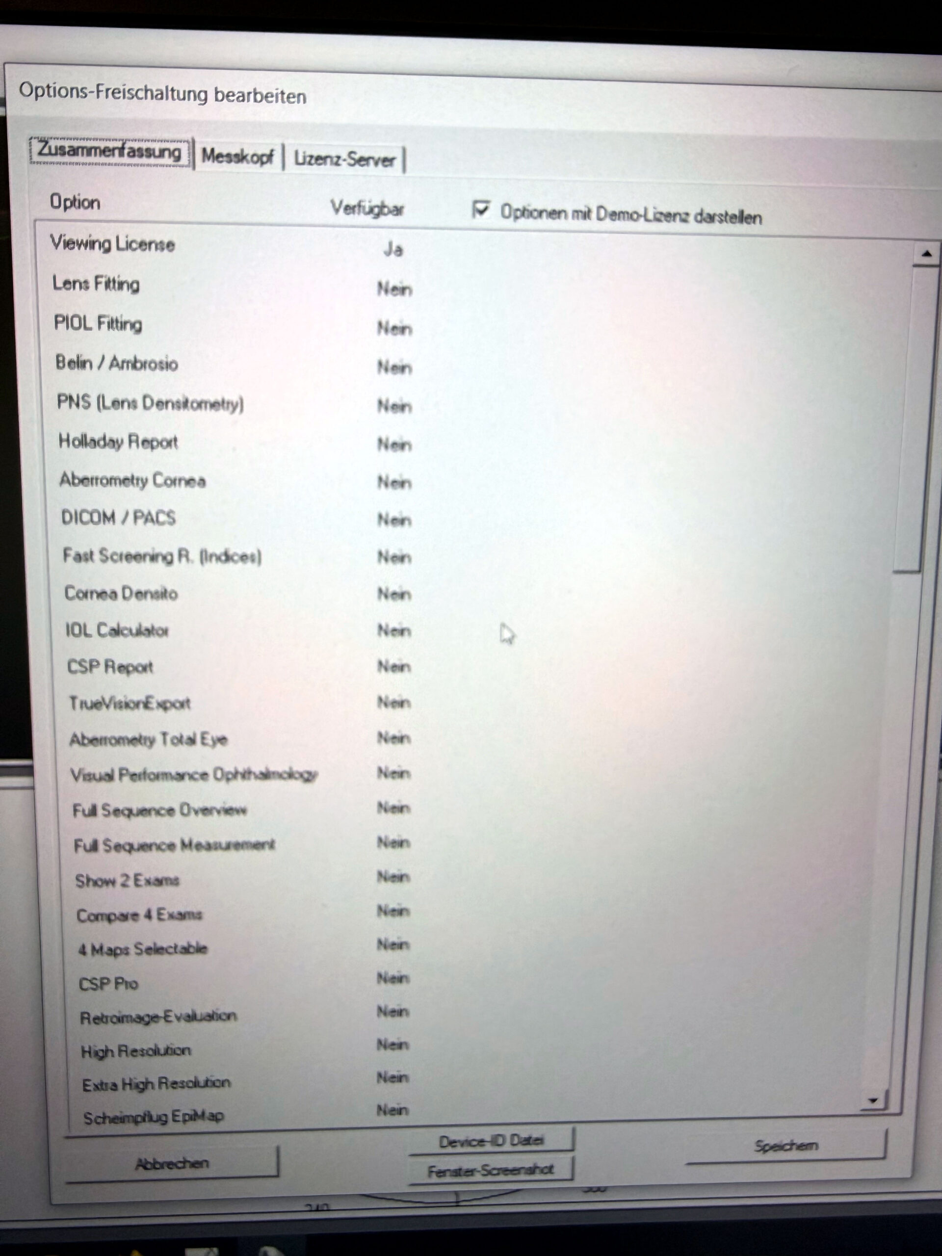 Nur Standardkonfiguration. Lizenzhinweis: Für optionale Softwaremodule (z. B. Belin/Ambrosio, Holladay-Bericht) ist kein zusätzlicher Dongle enthalten. Funktionalität: Voll funktionsfähig und getestet. Status: Sofort einsatzbereit mit Standard-Diagnosefunktionen.
