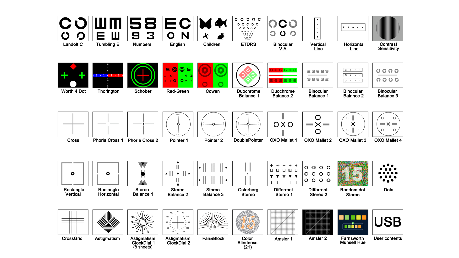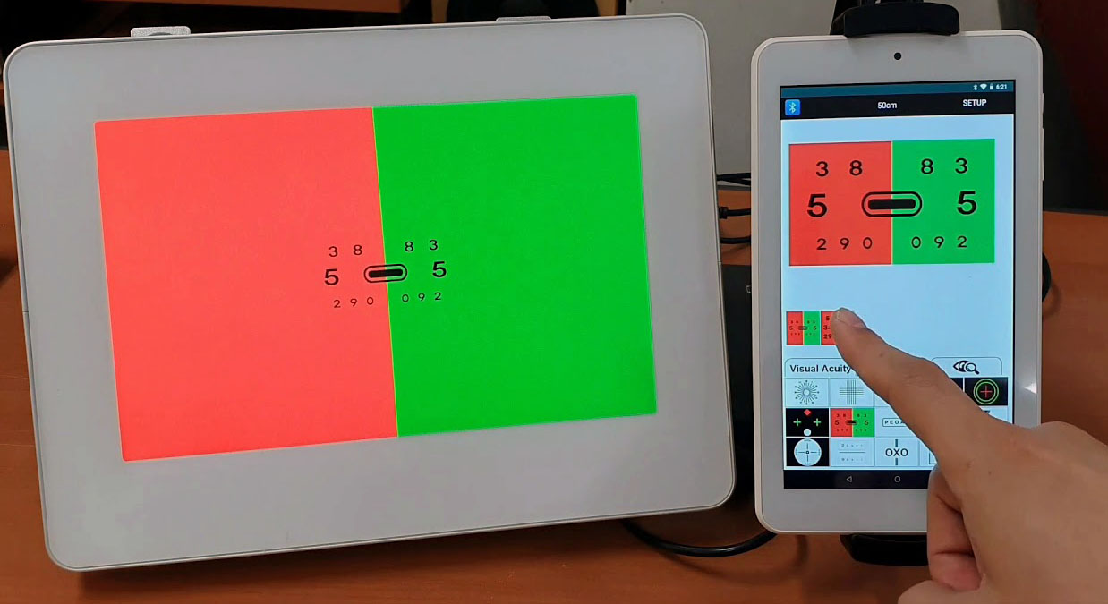 Anschlusstyp: Nidek/Huvitz/Topcon Phoropter-Refraktoren. 24-Zoll-Full-HD-Breitbilddisplay mit zirkularer Polarisation. Mit Fernbedienung (optionales Tablet: +390 €). Optotypen: Rot-Grün, E-Haken, Landolt-C, Kinderbilder. Hergestellt in Südkorea mit CE-, FC-, KFDA- und ISO-Zertifizierung.