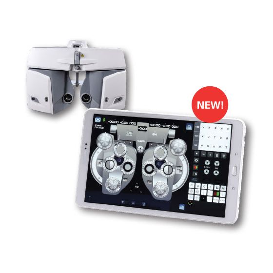 Einschließlich des automatischen Phoropters Visionix VX 65, des polarisierten Diagrammmonitors VX 22 und des Samsung-Tablets. Tablet im digitalen manuellen Phoroptermodus und im automatischen Phoroptermodus.